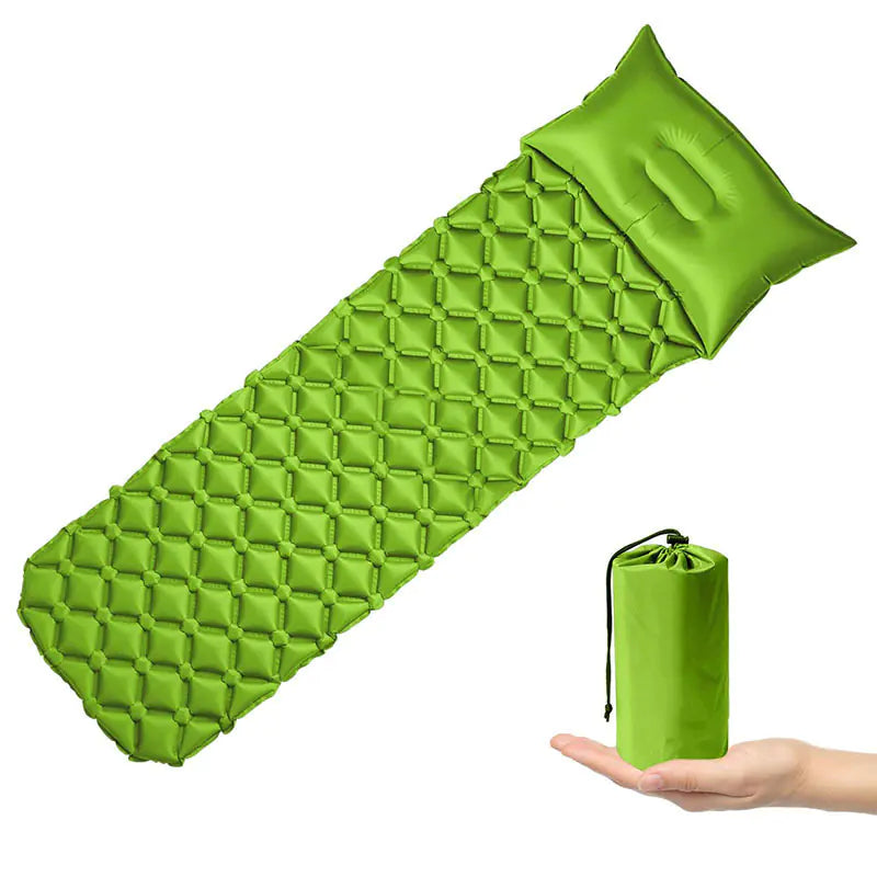 Lightweight and portable inflatable sleeping pad with built-in pillow, designed for outdoor camping, hiking, and beach use. Made from durable TPU material, it offers moisture-proof comfort and easy packing for your next adventure.
